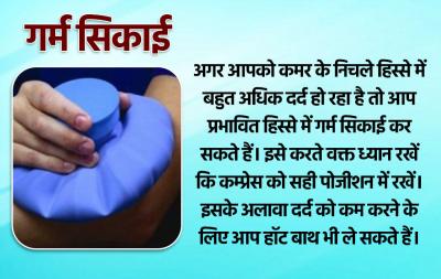 अगर आपको कमर के निचले हिस्से में बहुत अधिक दर्द हो रहा है तो आप प्रभावित हिस्से में गर्म सिकाई कर सकते हैं। इसे करते वक्त ध्यान रखें कि कम्प्रेस को सही पोजीशन में रखें। इसके अलावा दर्द को कम करने के लिए आप हॉट बाथ भी ले सकते हैं।