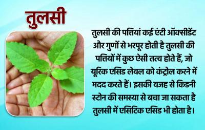 तुलसी की पत्तियां कई एंटी ऑक्सीडेंट और गुणों से भरपूर होती है तुलसी की पत्तियों में कुछ ऐसी तत्व होते हैं, जो यूरिक एसिड लेवल को कंट्रोल करने में मदद करते हैं। इसकी वजह से किडनी स्टोन की समस्या से बचा जा सकता है तुलसी में एसिटिक एसिड भी होता है।