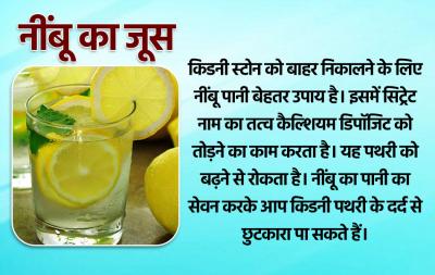 किडनी स्टोन को बाहर निकालने के लिए नींबू पानी बेहतर उपाय है। इसमें सिट्रेट नाम का तत्व कैल्शियम डिपॉजिट को तोड़ने का काम करता है। यह पथरी को बढ़ने से रोकता है। नींबू का पानी का सेवन करके आप किडनी पथरी के दर्द से छुटकारा पा सकते हैं।