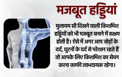 मुलायम सी दिखने वाली किशमिश हड्डियों को भी मजबूत बनाने में सक्षम होती है। ऐसे में अगर आप जोड़ों के दर्द, घुटनों के दर्द से परेशान रहते हैं तो आपके लिए किशमिश का सेवन करना काफी लाभदायक रहेगा।