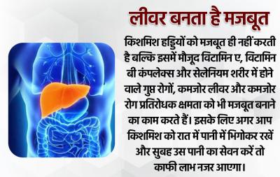 किशमिश हड्डियों को मजबूत ही नहीं करती है बल्कि इसमें मौजूद विटामिन ए, विटामिन बी कंपलेक्स और सेलेनियम शरीर में होने वाले गुप्त रोगों, कमजोर लीवर और कमजोर रोग प्रतिरोधक क्षमता को भी मजबूत बनाने का काम करते हैं। इसके लिए अगर आप किशमिश को रात में पानी में भिगोकर रखें और सुबह उस पानी का सेवन करें तो काफी लाभ नजर आएगा।