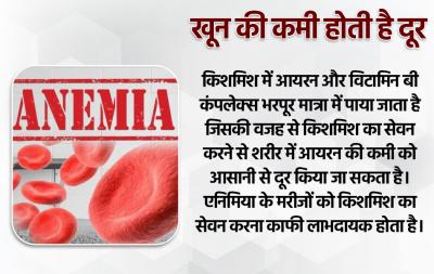 किशमिश में आयरन और विटामिन बी कंपलेक्स भरपूर मात्रा में पाया जाता है जिसकी वजह से किशमिश का सेवन करने से शरीर में आयरन की कमी को आसानी से दूर किया जा सकता है। एनिमिया के मरीजों को किशमिश का सेवन करना काफी लाभदायक होता है।