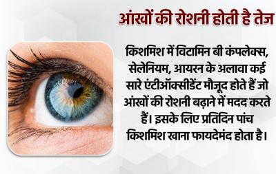 किशमिश में विटामिन बी कंपलेक्स, सेलेनियम, आयरन के अलावा कई सारे एंटीऑक्सीडेंट मौजूद होते हैं जो आंखों की रोशनी बढ़ाने में मदद करते हैं। इसके लिए प्रतिदिन पांच किशमिश खाना फायदेमंद होता है।