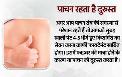 अगर आप पाचन तंत्र की समस्या से परेशान रहते हैं तो आपको सुबह खाली पेट 4-5 भीगे हुए किशमिश का सेवन करना काफी फायदेमंद साबित होगा। इसमें फाइबर की मात्रा होने के कारण या पाचन को दुरुस्त करता है।