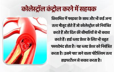 किशमिश में फाइबर के साथ और भी कई अन्य तत्व मौजूद होते हैं जो कोलेस्ट्रोल को नियंत्रित करते हैं और दिल की बीमारियों से भी बचाव करते हैं। हाई ब्लड प्रेशर के लिए भी बहुत फायदेमंद होता है। यह ब्लड प्रेशर को नियंत्रित करता है। इसमे पाए जाने वाला पोटैशियम तत्व हाइपरटेंशन से बचाव करता है।