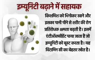किशमिश को भिगोकर खाने और इसका पानी पीने से शरीर की रोग प्रतिरोधक क्षमता बढ़ती है। इसमें एंटीऑक्सीडेंट पाया जाता है जो इम्यूनिटी को बूस्ट करता है। यह विटामिन सी का बेहतर स्रोत है।