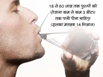 18 से 60 साल तक पुरुषों को रोजाना कम से कम 3 लीटर तक पानी पीना चाहिए। (इसका मतलब 14 गिलास)