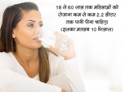18 से 60 साल तक महिलाओं को रोजाना कम से कम 2.2 लीटर तक पानी पीना चाहिए। (इसका मतलब 10 गिलास)