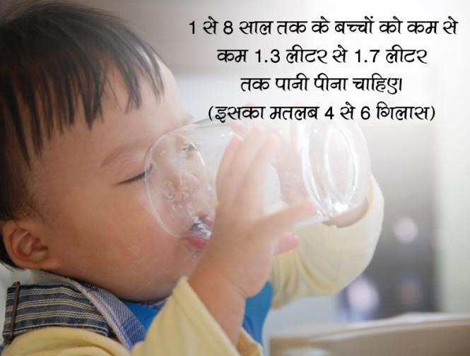 1 से 8 साल तक के बच्चों को कम से कम 1.3 लीटर से 1.7 लीटर तक पानी पीना चाहिए। (इसका मतलब 4 से 6 गिलास)