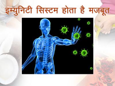 नारियल के सेवन से इम्यून सिस्टम को मजबूत बनाया जा सकता है और गर्भावस्था में एचआईवी, फ्लू, दाद इत्यादि से बचा जा सकता है।