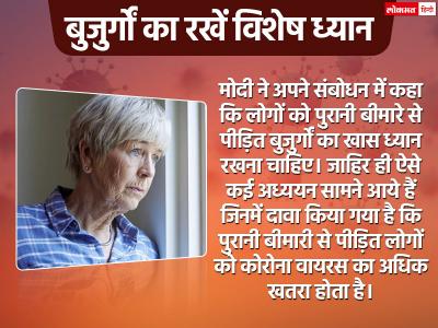 मोदी ने अपने संबोधन में कहा कि लोगों को पुरानी बीमारे से पीड़ित बुजुर्गों का खास ध्यान रखना चाहिए। जाहिर ही ऐसे कई अध्ययन सामने आये हैं जिनमें दावा किया गया है कि पुरानी बीमारी से पीड़ित लोगों को कोरोना वायरस का अधिक खतरा होता है।