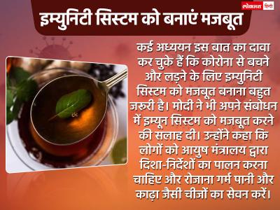 कई अध्ययन इस बात का दावा कर चुके हैं कि कोरोना से बचने और लड़ने के लिए इम्युनिटी सिस्टम को मजबूत बनाना बहुत जरूरी है। मोदी ने भी अपने संबोधन में इम्यून सिस्टम को मजबूत करने की सलाह दी। उन्होंने कहा कि लोगों को आयुष मंत्रालय द्वारा दिशा-निर्देशों का पालन करना चाहिए और रोजाना गर्म पानी और काढ़ा जैसी चीजों का सेवन करें।