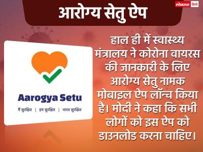 हाल ही में स्वास्थ्य मंत्रालय ने कोरोना वायरस की जानकारी के लिए आरोग्य सेतु नामक मोबाइल ऐप लॉन्च किया है। मोदी ने कहा कि सभी लोगों को इस ऐप को डाउनलोड करना चाहिए।