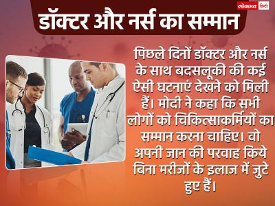 पिछले दिनों डॉक्टर और नर्स के साथ बदसलूकी की कई ऐसी घटनाएं देखने को मिली हैं। मोदी ने कहा कि सभी लोगों को चिकित्साकर्मियों का सम्मान करना चाहिए। वो अपनी जान की परवाह किये बिना मरीजों के इलाज में जुटे हुए हैं।