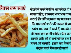 1 / 5मोटापे से बचने के लिए आपको हर दो घंटे में खाना चाहिए, खासकर अगर आप वजन कम कर रहे हैं। लेकिन इसका यह मतलब नहीं है कि आप अपने शरीर की जरूरत से ज्यादा खाएं। आप जब भी खाते हैं, आपको खाने की मात्रा कम करनी चाहिए। ऐसा करने से आपके शरीर को वो सभी पोषक तत्व मिल जाएंगे, जो जरूरी हैं। इसके बाद कैलोरी को कंट्रोल करने में सक्षम हो पाएंगे। 2 / 5जब कुछ चीज खाते हैं, तो आपको उस समय सिर्फ खाने पर ही ध्यान देना चाहिए। इस दौरान टीवी देखना या मोबाइल पर बात करने से आप देर तक और अधिक मात्रा में खा सकते हैं। इसके अलावा पेट दिमाग को यह सिग्नल नहीं भेज पाता है कि पेट भर गया है और आपको यह भी पता नहीं चलता कि आपने कितना खा लिया है। 3 / 5कई लोग जल्दी-जल्दी खाते हैं और खाने को अच्छी तरह चबाकर नहीं खाते हैं। इससे ना केवल खाने को पचाने में समस्या होती है बल्कि दिमाग को पेट भरने वाले मिलने वाले सिग्नल भी बाधित होते हैं। इसका परिणाम यह होता है कि आप ज्यादा खा लेते हैं।4 / 5एक्सपर्ट ऐसा मानते हैं कि तनाव में लोग ज्यादा खाते हैं। इसलिए आपको हमेशा दोस्तों और परिवार के साथ खाना चाहिए। इससे आपका ध्यान केवल खाने पर नहीं रहता है। जाहिर है ऐसे में आप ज्यादा खाने से बच सकते हैं। 5 / 5वजन कम करने के लिए पेट भरकर नाश्ता करना चाहिए। लेकिन आपके नाश्ते में प्रोटीन से भरपूर चीजें होनी चाहिए। इससे आपको भूख को कंट्रोल करने में मदद मिलती है।