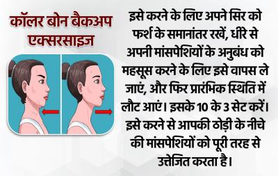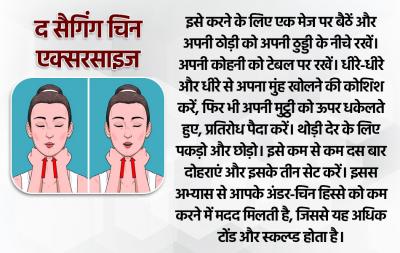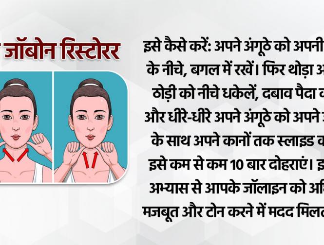 इसे कैसे करें: अपने अंगूठे को अपनी ठोड़ी के नीचे, बगल में रखें। फिर थोड़ा अपनी ठोड़ी को नीचे धकेलें, दबाव पैदा करें, और धीरे-धीरे अपने अंगूठे को अपने जबड़े के साथ अपने कानों तक स्लाइड करें। इसे कम से कम 10 बार दोहराएं। इससे अभ्यास से आपके जॉलाइन को अधिक मजबूत और टोन करने में मदद मिलती है।