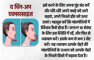 इसे करने के लिए अपना मुंह बंद करें और धीरे-धीरे अपने जबड़े को आगे बढ़ाएं, अपने निचले होंठ को ऊपर उठाएं। महसूस करें कि मांसपेशियों में खिंचाव कैसे होता है। लगभग 10 सेकंड के लिए इस स्थिति में रहें, और फिर से व्यायाम करें। इसके कम से कम 3 सेट करें। यह व्यायाम आपके चेहरे की मांसपेशियों के उत्थान को आपके चेहरे के निचले हिस्से में बढ़ावा देता है।