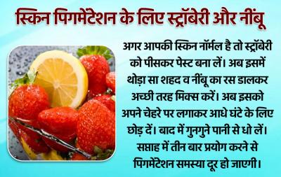 अगर आपकी स्किन नॉर्मल है तो स्ट्रॉबेरी को पीसकर पेस्ट बना लें। अब इसमें थोड़ा सा शहद व नींबू का रस डालकर अच्छी तरह मिक्स करें। अब इसको अपने चेहरे पर लगाकर आधे घंटे के लिए छोड़ दें। बाद में गुनगुने पानी से धो लें। सप्ताह में तीन बार प्रयोग करने से पिगमेंटेशन समस्या दूर हो जाएगी।