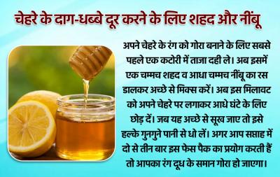 अपने चेहरे के रंग को गोरा बनाने के लिए सबसे पहले एक कटोरी में ताजा दही ले। अब इसमें एक चम्मच शहद व आधा चम्मच नींबू का रस डालकर अच्छे से मिक्स करें। अब इस मिलावट को अपने चेहरे पर लगाकर आधे घंटे के लिए छोड़ दें।