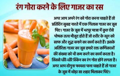 अगर आप अपने रंग को गोरा करना चाहते हैं तो प्रतिदिन सुबह नाश्ते में एक गिलास गाजर का जूस पिए। गाजर के जूस में भरपूर मात्रा में कुछ ऐसे पोषक तत्व मौजूद होते हैं जो शरीर के खून को साफ और शुद्ध बनाने का कार्य करते हैं।