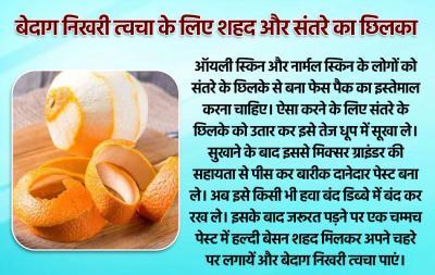 ऑयली स्किन और नार्मल स्किन के लोगों को संतरे के छिलके से बना फेस पैक का इस्तेमाल करना चाहिए। ऐसा करने के लिए संतरे के छिलके को उतार कर इसे तेज धूप में सूखा ले। सुखाने के बाद इससे मिक्सर ग्राइंडर की सहायता से पीस कर बारीक दानेदार पेस्ट बना ले। अब इसे किसी भी हवा बंद डिब्बे में बंद कर रख ले। इसके बाद जरूरत पड़ने पर एक चम्मच पेस्ट में हल्दी बेसन शहद मिलकर अपने चहरे पर लगायें और बेदाग निखरी त्वचा पाएं।
