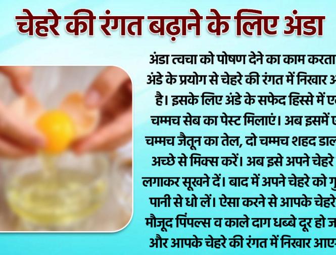 अंडा त्वचा को पोषण देने का काम करता है। अंडे के प्रयोग से चेहरे की रंगत में निखार आता है। इसके लिए अंडे के सफेद हिस्से में एक चम्मच सेब का पेस्ट मिलाएं। अब इसमें एक चम्मच जैतून का तेल, दो चम्मच शहद डालकर अच्छे से मिक्स करें। अब इसे अपने चेहरे पर लगाकर सूखने दें। बाद में अपने चेहरे को गुनगुने पानी से धो लें। ऐसा करने से आपके चेहरे पर मौजूद पिंपल्स व काले दाग धब्बे दूर हो जाएंगे और आपके चेहरे की रंगत में निखार आएगा।