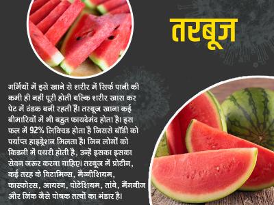 गर्मियों में इसे खाने से शरीर में सिर्फ पानी की कमी ही नहीं पूरी होती बल्कि शरीर खास कर पेट में ठंडक बनी रहती हैं। तरबूज खाना कई बीमारियों में भी बहुत फायदेमंद होता है। इस फल में 92% लिक्विड होता है जिससे बॉडी को पर्याप्त हाइड्रेशन मिलता है। जिन लोगों को किडनी में पथरी होती है, उन्हें इसका इसका सेवन जरूर करना चाहिए।