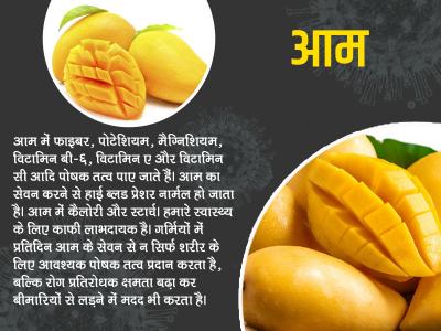 आम में फाइबर, पोटेशियम, मैग्निशियम, विटामिन बी-6, विटामिन ए और विटामिन सी आदि पोषक तत्व पाए जाते हैं। आम का सेवन करने से हाई ब्लड प्रेशर नार्मल हो जाता है। आम में कैलोरी और स्टार्च, हमारे स्वास्थ्य के लिए काफी लाभदायक है। गर्मियों में प्रतिदिन आम के सेवन से न सिर्फ शरीर के लिए आवश्यक पोषक तत्व प्रदान करता है, बल्कि रोग प्रतिरोधक क्षमता बढ़ा कर बीमारियों से लड़ने में मदद भी करता है।