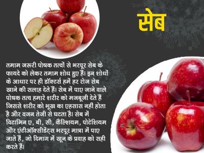 तमाम जरूरी पोषक तत्वों से भरपूर सेब के फायदे को लेकर तमाम शोध हुए हैं। इन शोधों के आधार पर ही डॉक्टर्स हमें हर रोज सेब खाने की सलाह देते हैं। सेब सबसे ज्यादा पापुलर फलों में शामिल है। सेब में पाए जाने वाले पोषक तत्व हमारे शरीर को मजबूजी देते हैं जिससे शरीर को भूख का एहसास नहीं होता है और वजन तेजी से घटता है। सेब में विटामिन ए, बी, सी, कैल्शियम, पोटेशियम और एंटीऑक्सीडेंट्स भरपूर मात्रा में पाए जाते हैं, जो दिमाग में खून के प्रवाह को सही करते हैं।