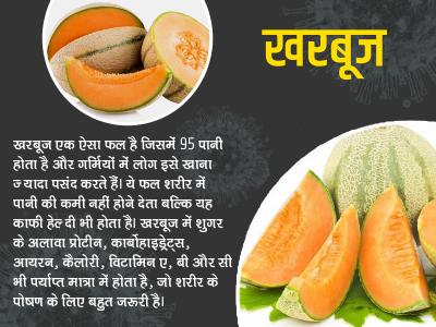 खरबूज एक ऐसा फल है जिसमें 95 पानी होता है और गर्मियों में लोग इसे खाना ज्यादा पसंद करते हैं। ये फल शरीर में पानी की कमी नहीं होने देता बल्कि यह काफी हेल्दी भी होता है। खरबूज में शुगर के अलावा प्रोटीन, कार्बोहाइड्रेट्स, आयरन, कैलोरी, विटामिन ए, बी और सी भी पर्याप्त मात्रा में होता है, जो शरीर के पोषण के लिए बहुत जरूरी है।