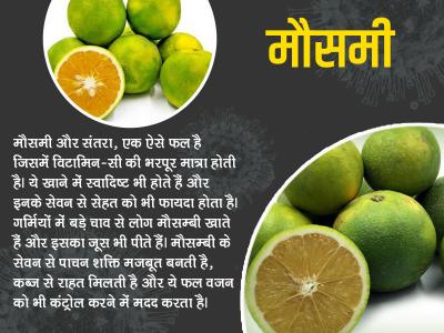 मौसमी और संतरा, एक ऐसे फल है जिसमें विटामिन-सी की भरपूर मात्रा होती है। ये खाने में स्वादिष्ट भी होते हैं और इनके सेवन से सेहत को भी फायदा होता है। गर्मियों में बड़े चाव से लोग मौसम्बी खाते हैं और इसका जूस भी पीते हैं। मौसम्बी के सेवन से पाचन शक्ति मजबूत बनती है, कब्ज से राहत मिलती है और ये फल वजन को भी कंट्रोल करने में मदद करता है।