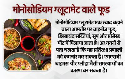 मोनोसोडियम ग्लूटामेट एक स्वाद बढ़ाने वाला आमतौर पर चाइनीज फूड, डिब्बाबंद सब्जियां, सूप और प्रोसेस्ड मीट में मिलाया जाता है। अध्ययनों से पता चलता है कि यह प्रतिरक्षा प्रणाली को कमजोर कर सकता है। एमएसजी थाइमस और प्लीहा जैसी समस्याओं का कारण बन सकता है।
