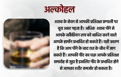 शराब के सेवन से आपकी प्रतिरक्षा प्रणाली पर बुरा असर पड़ता है। अधिक शराब पीने से आपके सर्कैडियन लय को बाधित करने वाले आपके हार्मोन प्रभावित हो सकते हैं। यही कारण है कि आप पीने के बाद रात के बीच में जाग सकते हैं। आपकी नींद का चक्र आपके प्रतिरक्षा समारोह से जुड़ा है इसलिए नींद के प्रभावित होने से आपका शरीर कमजोर हो सकता है।