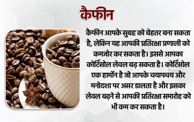 कैफीन आपके सुबह को बेहतर बना सकता है, लेकिन यह आपकी प्रतिरक्षा प्रणाली को कमजोर कर सकता है। इससे आपका कोर्टिसोल लेवल बढ़ सकता है। कोर्टिसोल एक हार्मोन है जो आपके चयापचय और मनोदशा पर असर डालता है और इसका लेवल बढ़ने से आपकी प्रतिरक्षा समारोह को भी कम कर सकता है।