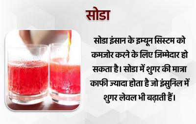 सोडा इंसान के इम्यून सिस्टम को कमजोर करने के लिए जिम्मेदार हो सकता है। सोडा में शुगर की मात्रा काफी ज्यादा होता है जो इंसुनिल में शुगर लेवल भी बढ़ाती हैं।