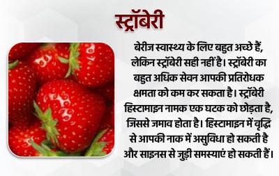 बेरीज स्वास्थ्य के लिए बहुत अच्छे हैं, लेकिन स्ट्रॉबेरी सही नहीं है। स्ट्रॉबेरी का बहुत अधिक सेवन आपकी प्रतिरोधक क्षमता को कम कर सकता है। स्ट्रॉबेरी हिस्टामाइन नामक एक घटक को छोड़ता है, जिससे जमाव होता है। हिस्टामाइन में वृद्धि से आपकी नाक में असुविधा हो सकती है और साइनस से जुड़ी समस्याएं हो सकती हैं।