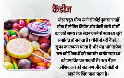 थोड़ा बहुत मीठा खाने से कोई नुकसान नहीं होता है लेकिन कैंडीज और जेली जैसी चीजों का लंबे समय तक सेवन करने से स्वास्थ्य बुरी प्रभावित हो सकता है। चीनी से भरी कैंडीज सूजन का कारण बनता है और यह आगे सफेद रक्त कोशिकाओं को कमजोर करके स्वास्थ्य को प्रभावित कर सकती है। रक्त में इन कोशिकाओं को संक्रमण और एंटीबॉडी से लड़ने के लिए जाना जाता है।