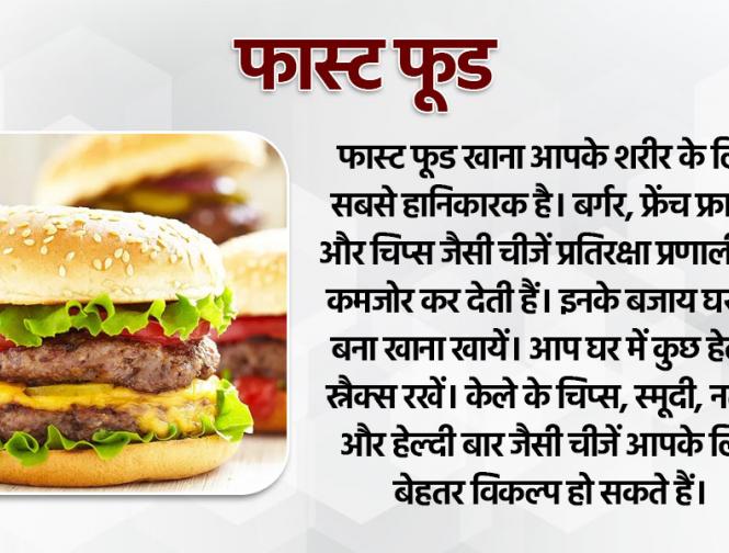 फास्ट फूड खाना आपके शरीर के लिए सबसे हानिकारक है। बर्गर, फ्रेंच फ्राइज और चिप्स जैसी चीजें प्रतिरक्षा प्रणाली को कमजोर कर देती हैं। इनके बजाय घर पर बना खाना खायें। आप घर में कुछ हेल्दी स्नैक्स रखें। केले के चिप्स, स्मूदी, नट्स, और हेल्दी बार जैसी चीजें आपके लिए बेहतर विकल्प हो सकते हैं।