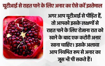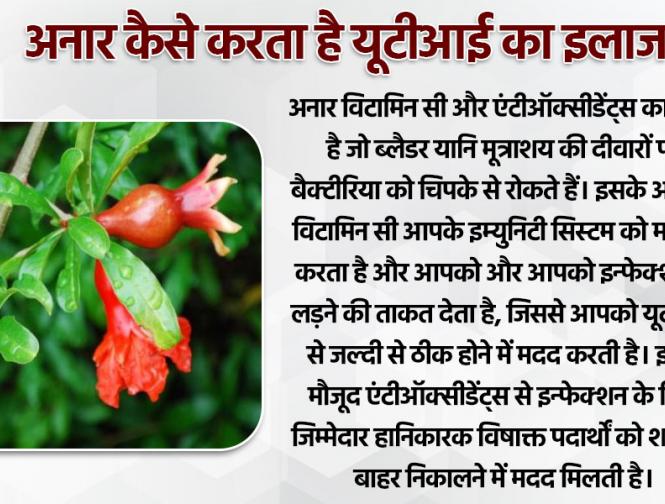 अगर आप यूटीआई से पीड़ित हैं, तो आपको इसके लक्षणों से राहत पाने के लिए रोजाना रात को खाने के बाद एक कटोरी अनार खाना चाहिए। इसके अलावा आप नियमित रूप से अनार का जूस भी पी सकते हैं।