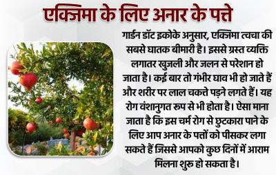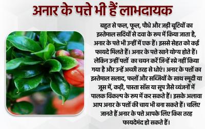 बहुत से फल, फूल, पौधे और जड़ी बूटियों का इस्तेमाल सदियों से दवा के रूप में किया जाता है, अनार के पत्ते भी उन्हीं में एक हैं। इससे सेहत को कई फायदे मिलते हैं। अनार के पत्ते खाने योग्य होते हैं। लेकिन उन्हीं पत्तों का चयन करें जिन्हें स्प्रे नहीं किया गया है और उन्हें अच्छी तरह से धोएं।