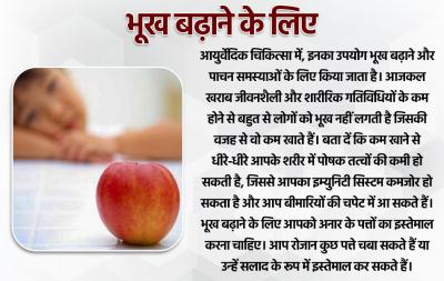 आयुर्वेदिक चिकित्सा में, इनका उपयोग भूख बढ़ाने और पाचन समस्याओं के लिए किया जाता है। आजकल खराब जीवनशैली और शारीरिक गतिविधियों के कम होने से बहुत से लोगों को भूख नहीं लगती है जिसकी वजह से वो कम खाते हैं। बता दें कि कम खाने से धीरे-धीरे आपके शरीर में पोषक तत्वों की कमी हो सकती है, जिससे आपका इम्युनिटी सिस्टम कमजोर हो सकता है और आप बीमारियों की चपेट में आ सकते हैं। भूख बढ़ाने के लिए आपको अनार के पत्तों का इस्तेमाल करना चाहिए। आप रोजान कुछ पत्ते चबा सकते हैं या उन्हें सलाद के रूप में इस्तेमाल कर सकते हैं।