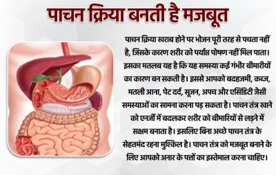 पाचन क्रिया खराब होने पर भोजन पूरी तरह से पचता नहीं है, जिसके कारण शरीर को पर्याप्त पोषण नहीं मिल पाता। इसका मतलब यह है कि यह समस्या कई गंभीर बीमारीयों का कारण बन सकती है। इससे आपको बदहजमी, कब्ज, मतली आना, पेट दर्द, सूजन, अपच और एसिडिटी जैसी समस्याओं का सामना करना पड़ सकता है। पाचन तंत्र खाने को एनर्जी में बदलकर शरीर को बीमारियों से लड़ने में सक्षम बनाता है। इसलिए बिना अच्छे पाचन तंत्र के सेहतमंद रहना मुश्किल है। पाचन तंत्र को मजबूत बनाने के लिए आपको अनार के पत्तों का इस्तेमाल करना चाहिए।