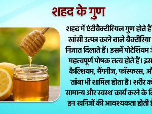 1 / 6शहद में एंटीबैक्टीरियल गुण होते हैं जो खांसी उत्पन्न करने वाले बैक्टीरिया से निजात दिलाते हैं। इसमें पोटेशियम जैसे महत्वपूर्ण पोषक तत्व होते हैं। इसमें कैल्शियम, मैंगनीज, फॉस्फरस, और तांबा भी शामिल होता है। शरीर को सामान्य और स्वस्थ कार्य करने के लिए इन खनिजों की आवश्यकता होती है।2 / 6एक कप आर्गेनिक शहद में 3 बड़े चम्मच नींबू का रस मिला लें। इसमें 1/4 कप गर्म पानी डालकर अच्छी तरह मिला लें। खांसी के लिए इस मिश्रण का 1 बड़ा चम्मच दिन में दो बार लें। एक बार दिन में और एक बार सोने से पहले। बचे हुए मिश्रण को फ्रिज में रख दें। इसे आप एक महीने तक प्रयोग कर सकते हैं।3 / 6शहद खांसी से राहत दिला सकता है। बच्चों में रात में खांसी के उपचार के लिए यह बेहतर विकल्प है। खांसी के इलाज के लिए शहद का उपयोग करने के लिए आप इसे गर्म पानी या एक हर्बल चाय के साथ 2 चम्मच मिलाकर पी सकते हैं। इस मिश्रण को दिन में एक या दो बार लें। एक साल से कम उम्र के बच्चों को शहद न दें।4 / 6आधा चम्मच अदरक पाउडर और एक चम्मच शहद खांसी-जुकाम को ठीक करने के लिए बेहद फायदेमंद होते हैं। अदरक में भी एंटी-बैक्टीरियल और एंटी-इंफ्लेमेट्री गुण होते हैं। एक साथ अदरक और शहद का सेवन खांसी-जुकाम को तेजी से ठीक करने में मदद करता है।5 / 6लहसुन सल्फर के साथ-साथ एंटी-इंफ्लेमेट्री और एंटी-बैक्टीरियल गुण भी होते हैं इसलिए शहद के साथ लहसुन का पेस्ट मिलाकर एक चम्मच सेवन करना ही खांसी-जुकाम को ठीक करने के लिए बेहद फायदेमंद होता है।6 / 6एक चम्मच शहद में काली मिर्च पाउडर मिलाकर खाने से खांसी-जुकाम की समस्या तो दूर होती ही है साथ ही इससे सीने में संक्रमण की परेशानी भी दूर हो जाती है। इसलिए खांसी-जुकाम को दूर करने के लिए शहद और काली मिर्च का सेवन लाभकारी होता है।