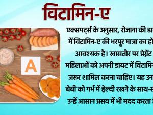 1 / 6एक्सपर्ट्स के अनुसार, रोजाना की डायट में विटामिन-ए की भरपूर मात्रा का होना आवश्यक है। खासतौर पर प्रेग्नेंट महिलाओं को अपनी डायट में विटामिन-ए जरूर शामिल करना चाहिए। यह उनके बेबी को गर्भ में हेल्दी रखने के साथ-साथ उन्हें आसान प्रसव में भी मदद करता है। 2 / 6लिस्ट में सबसे पहले नंबर पर है लाल-लाल गाजर। एक कप कटी हुई गाजर में 334 प्रतिशत विटामिन-ए होता है जो हमारी 3 से 4 दिन की विटामिन की जरूरत को पूरा कर सकता है। गाजर की सब्जी या जूस दोनों ही सेहत के लिए फायदेमंद है, लेकिन गाजर को सीधा खाना आधिक फायदे वाला बताया जाता है। 3 / 6शकरकंद यानी स्वीट पोटेटो या मीठा आलू, यह आलू का ही एक प्रकार माना जाता है लेकिन स्वाद में मीठा होता है। सर्दियों में आपको यह सबसे अधिक मिल जाएगा। शकरकंद विटामिन-ए से भरपूर होता है और इसे उबालकर जरा सा मसाले डालकर खाने से स्वादिष्ट भी लगता है।4 / 6पालक, सरसों का साग, मेथी, ऐसी ही हरी पत्तेदार सब्जियों में विटामिन-ए की भरपूर मात्रा पाई जाती है। लेकिन इन सब्जियों को कभी भी अधिक पकाना नहीं चाहिए। बस अच्छे से साफ करें, कूकर में डालें और नर्म हो जाने पर नमक मिर्ची डालकर ऐसे ही खाएं। तभी अधिक फायदा मिलेगा। 5 / 6नेचुरल हर्ब्स जैसे कि धनिया, पुदीना, तुलसी की पत्तियों में विटामिन-ए पाया जाता है। इन्हें अपनी रोजाना की डायट में किसी भी रूप में शामिल करने की कोशिश करें, विटामिन-ए की कमी से जल्द से जल्द छुटकारा पा सकते हैं।6 / 6दिन में एक ग्लास दूध या दूध से बनी चीजें जैसे कि पनीर, दही जरूर लेना चाहिए। लेकिन कोशिश करें कि दूध ही लें। अगर आपको सादा दूध पीना पसंद नहीं है तो दूध में कोई फ्लेवर मिला लें।
