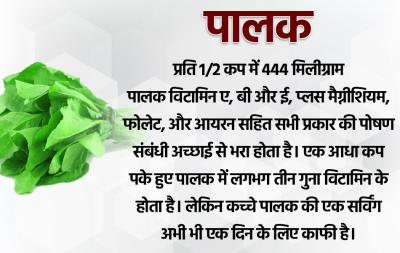 पालक विटामिन ए, बी और ई, प्लस मैग्नीशियम, फोलेट, और आयरन सहित सभी प्रकार की पोषण संबंधी अच्छाई से भरा होता है। एक आधा कप पके हुए पालक में लगभग तीन गुना विटामिन के होता है। लेकिन कच्चे पालक की एक सर्विंग अभी भी एक दिन के लिए काफी है।