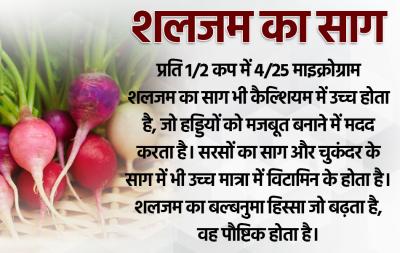 शलजम का साग भी कैल्शियम में उच्च होता है, जो हड्डियों को मजबूत बनाने में मदद करता है। सरसों का साग और चुकंदर के साग में भी उच्च मात्रा में विटामिन के होता है। शलजम का बल्बनुमा हिस्सा जो बढ़ता है, वह पौष्टिक होता है।