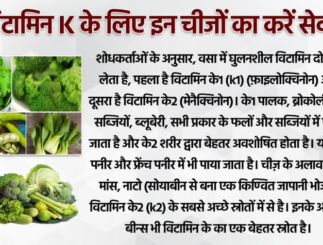 शोधकर्ताओं के अनुसार, वसा में घुलनशील विटामिन दो रूप लेता है, पहला है विटामिन के1 (k1) (फ़ाइलोक्विनोन) और दूसरा है विटामिन के2 (मेनैक्विनोन)। के1 पालक, ब्रोकोली, हरी सब्जियों, ब्लूबेरी, सभी प्रकार के फलों और सब्जियों में पाया जाता है और के2 शरीर द्वारा बेहतर अवशोषित होता है।