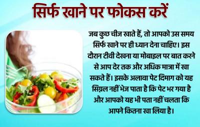 जब कुछ चीज खाते हैं, तो आपको उस समय सिर्फ खाने पर ही ध्यान देना चाहिए। इस दौरान टीवी देखना या मोबाइल पर बात करने से आप देर तक और अधिक मात्रा में खा सकते हैं। इसके अलावा पेट दिमाग को यह सिग्नल नहीं भेज पाता है कि पेट भर गया है और आपको यह भी पता नहीं चलता कि आपने कितना खा लिया है।