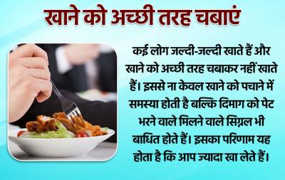 कई लोग जल्दी-जल्दी खाते हैं और खाने को अच्छी तरह चबाकर नहीं खाते हैं। इससे ना केवल खाने को पचाने में समस्या होती है बल्कि दिमाग को पेट भरने वाले मिलने वाले सिग्नल भी बाधित होते हैं। इसका परिणाम यह होता है कि आप ज्यादा खा लेते हैं।