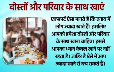 एक्सपर्ट ऐसा मानते हैं कि तनाव में लोग ज्यादा खाते हैं। इसलिए आपको हमेशा दोस्तों और परिवार के साथ खाना चाहिए। इससे आपका ध्यान केवल खाने पर नहीं रहता है। जाहिर है ऐसे में आप ज्यादा खाने से बच सकते हैं।